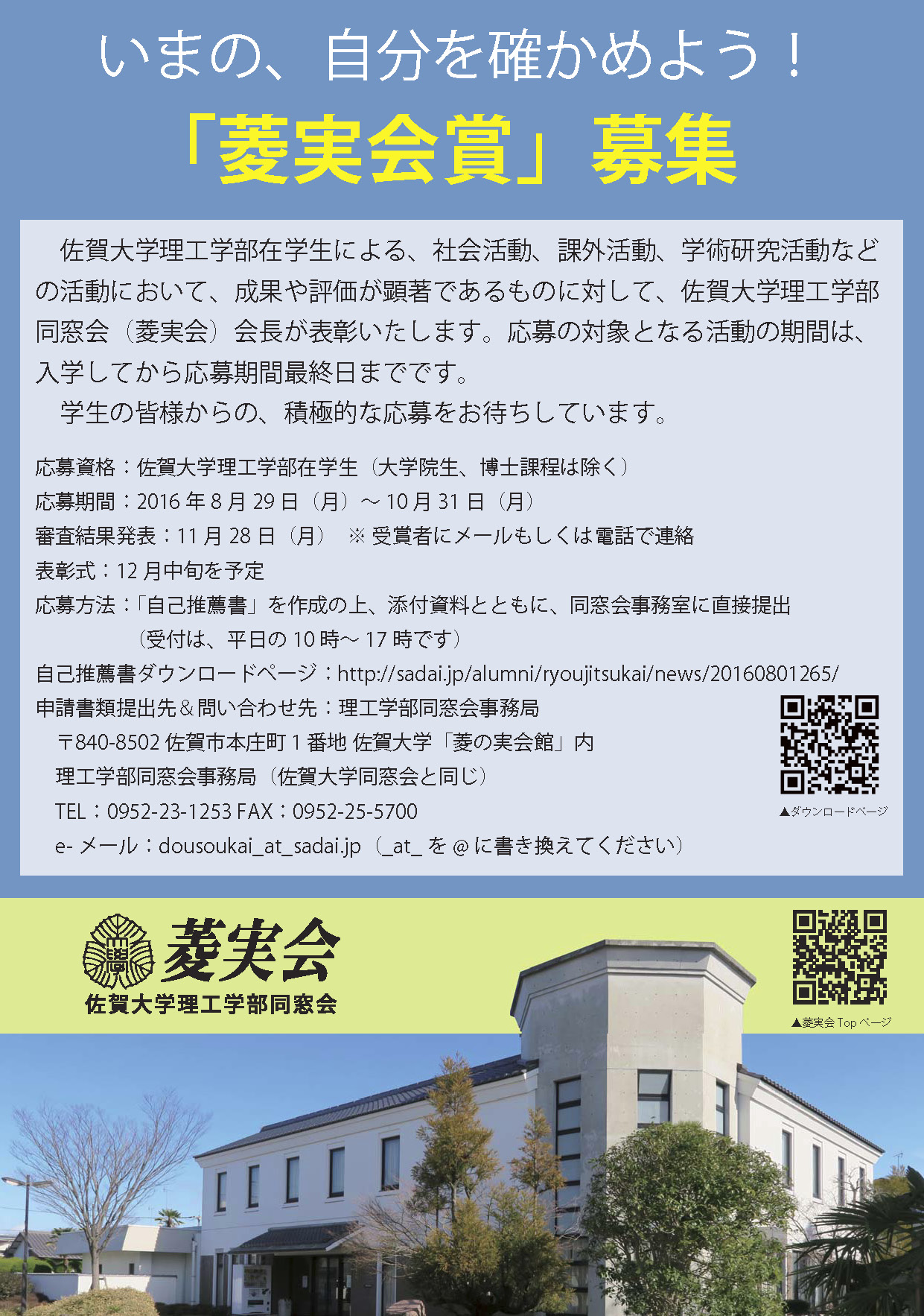 佐賀大学理工学部在学生による、社会活動、課外活動、学術研究活動などの活動において、成果や評価が顕著であるものに対して、佐賀大学理工学部同窓会(菱実会)が表彰いたします。 学生の皆様からの、積極的な応募をお待ちしています。 詳細は、以下のページにてご確認ください。ryoujitsukaisyou