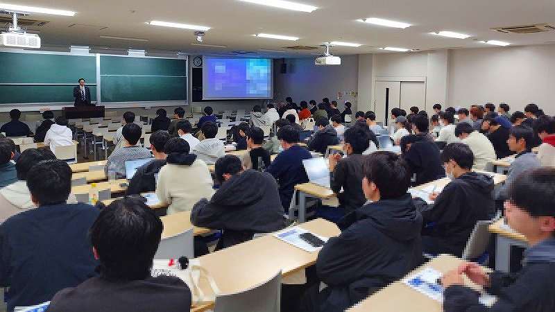 本講演はまず自己紹介、特に趣味の話から始まり、車の燃費を統計的に分析されているというお話に、多くの学生が引き込まれていました。次に、半導体業界および会社のご紹介があり、イメージセンサ技術の解説をはじめ、これからの展望、働く環境、社風など詳しくお話しいただきました。多くの学生にとってある程度知っている会社ではあったようですが、詳しく知ることができてよかった・興味を持ったなどの感想が多数寄せられました。さらに、ご自身の経験を交えながら、製造に関する様々な仕事の内容を解像度高くご説明いただきました。何をしてお給料をもらっているのかという点を含めて非常にわかりやすくご説明いただき、働くイメージが持てた・今学んでいることが仕事にどうつながるか分かったなどの感想を持つ学生が多くいました。学生のうちに学んでおくと良いことなどに関するアドバイスもいただき、聴講学生にとって非常に得るものの多いご講演でした。