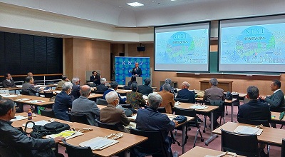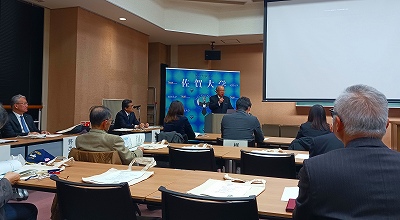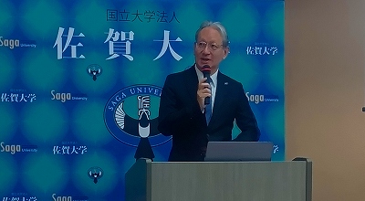 大島一里副学長の司会で、はじめに佐賀大学役員の紹介があり、続いて主催者を代表して野出孝一学長から歓迎の辞・大学の現状報告がありました。佐賀大学卒業生の就職率は99.5%で九州地区1位で、女子学生比率も43%と高いこと、コスメティックサイエンス学環などの紹介がありました。なお、野出学長は1988(S63)年3月佐賀医科大学医学科の卒業生で、学長任期は2025(R7)年10月1日~2029(R11)年9月30日とのことでした。